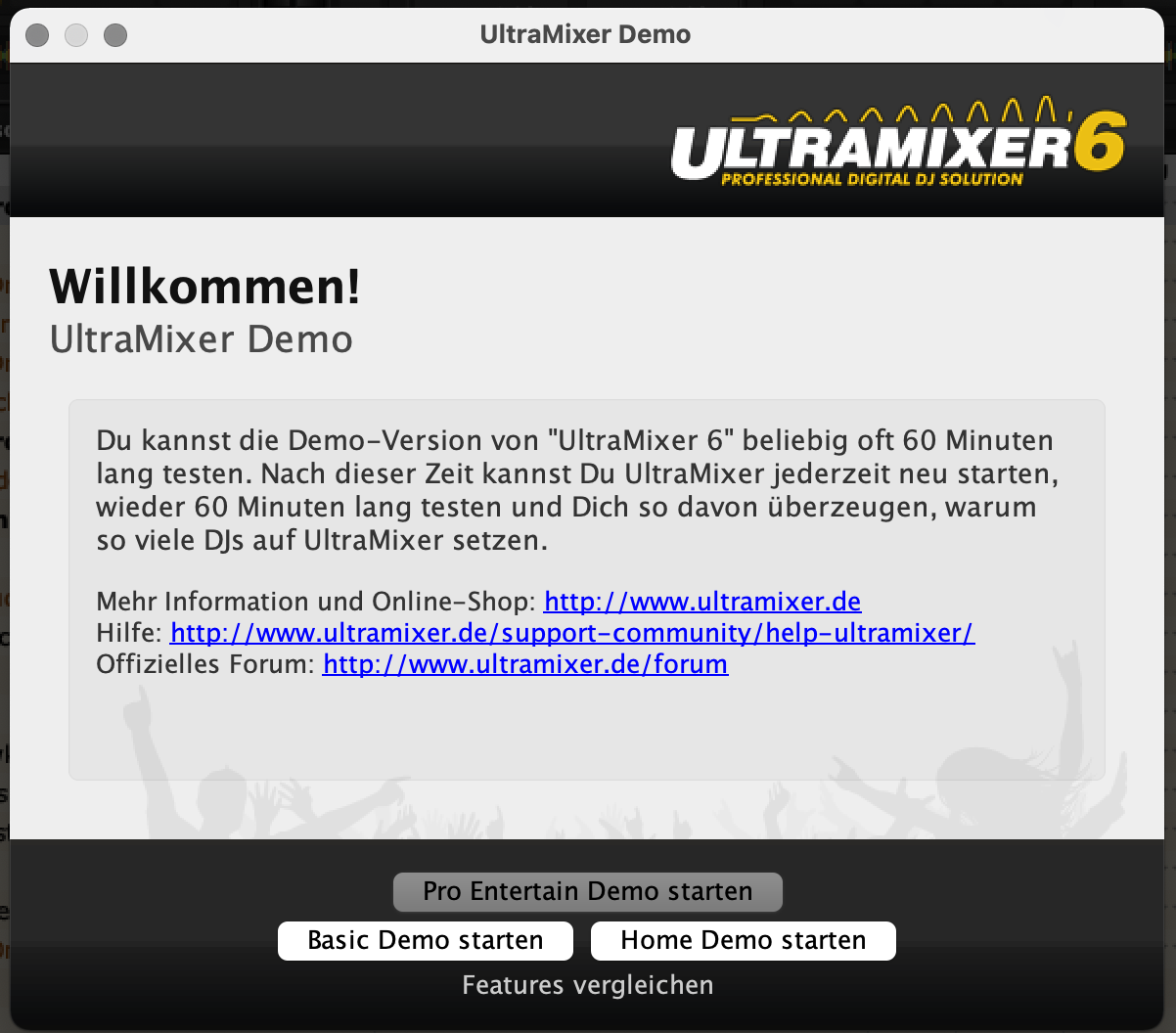 Lade dir dann die aktuelle UltraMixer-Version von unserer Homepage herunter und installiere sie. UltraMixer startet nach Öffnung des Programms als Demo. Es erscheint der folgende Dialog: