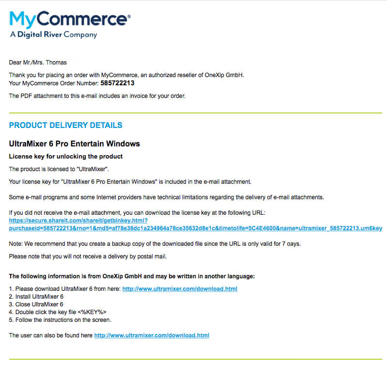 Nach einem Kauf von UltraMixer über unsere Website erhältst du automatisch eine Email von unserem Lizenzauslieferer MyCommerce mit deiner Bestellnummer und Lizenzschlüssel-Datei (.um6key) im Anhang.
