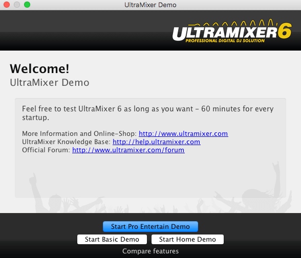 Lade dir zunächst die aktuelle UltraMixer-Version von unserer Homepage herunter und installiere sie. UltraMixer startet nach Öffnung des Programms als Demo. Es erscheint der folgende Dialog: