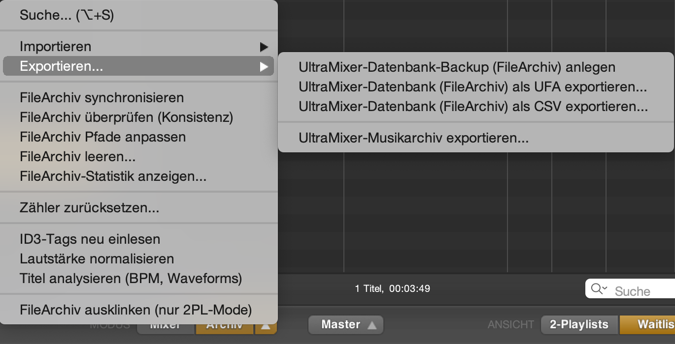 Du kannst dein FileArchive einfach mit eingebauten Funktionen innerhalb von UltraMixer exportieren. Öffne das entsprechende Menü mit einem Klick auf das Pfeilsymbol neben „Archive“ in der unteren Leiste von UltraMixer. Hier kannst du zwischen verschiedenen Möglichkeiten wählen.
