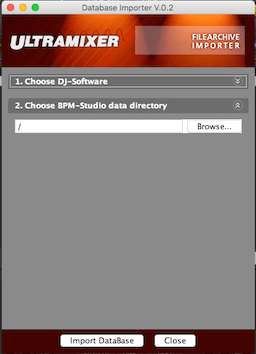 Im Database Importer wird unter „Choose DJ-Software“ BPM Studio angezeigt. Mit „Choose BPM Studio data directory“ kannst du nun das BPM Musikarchiv auf deinem Rechner suchen und auswählen.