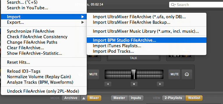 Starte UltraMixer und klick in der untersten Leiste neben „Archiv“ auf das Pfeilsymbol. In dem Menü klickst du dann auf „Importieren“ > „BPM-Studio-Archiv importieren“.