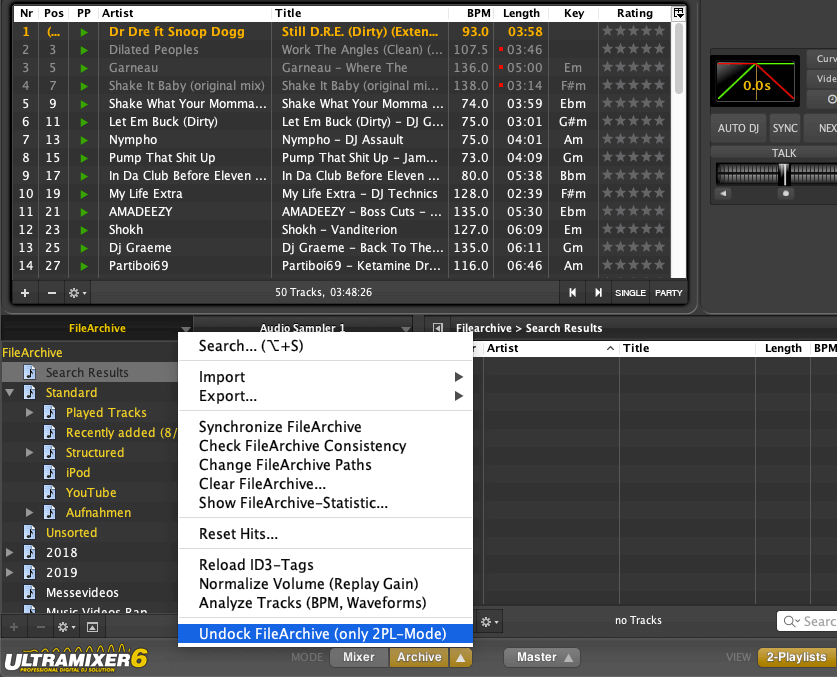 Klicke dazu das Pfeilsymbol neben „Archive“ am unteren Rand des UltraMixer-Fensters und wähle „FileArchive ausklinken“.