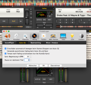 Unter „Auto-DJ“ kannst du bei „Pause vor dem Track“ einstellen wie viele Sekunden vergehen sollen bevor der nächste Titel anfängt zu spielen. Die Pause-Zeiten werden zur eingestellten Blendzeit addiert. Wenn die Eingestellte Blendzeit 5 Sekunden beträgt und die Pause auf 5 Sekunden gestellt wurde, dauert es 10 Sekunden bis der neue Titel gespielt wird.