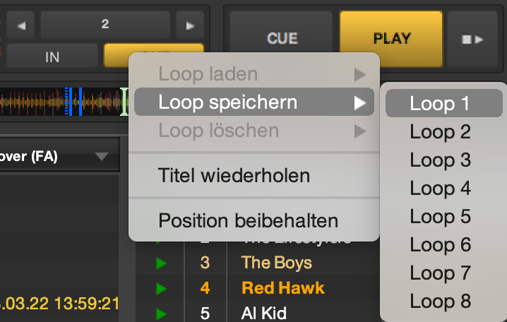Ein Rechtsklick auf eine der Loopschaltflächen öffnet das Loop-Einstellungsmenu. Über dieses Menü können gesetzte Loops gespeichert, bereits gesicherte Loops geladen oder auch der ganze Titel wiederholt werden.