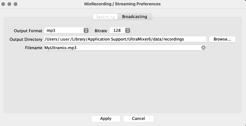 Passe deine Einstellungen an: Wähle den Dateityp, einen Namen für deinen Mix und das Verzeichnis, wo du diesen abspeichern möchtest. Übernimm die Änderungen, und starte dann deine Aufnahme mit einem Klick auf den roten Button.