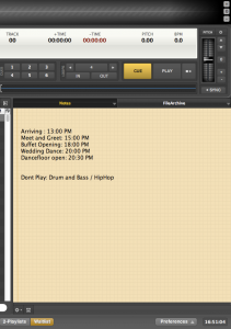 Ein kleiner Moderationsplan mit wichtigen Hinweisen z.B. „Name Braut / Bräutigam , Buffet Eröffnung, etc. hilft euch die richtige Information zur richtigen Zeit parat zu haben. UltraMixer Pro hilft euch hierbei mit der „Notiz-Funktion“. Mit diesem „Widget“ könnt ihr direkt in der DJ-Software kurze Information abrufbereit halten und diese gezielt anmoderieren.